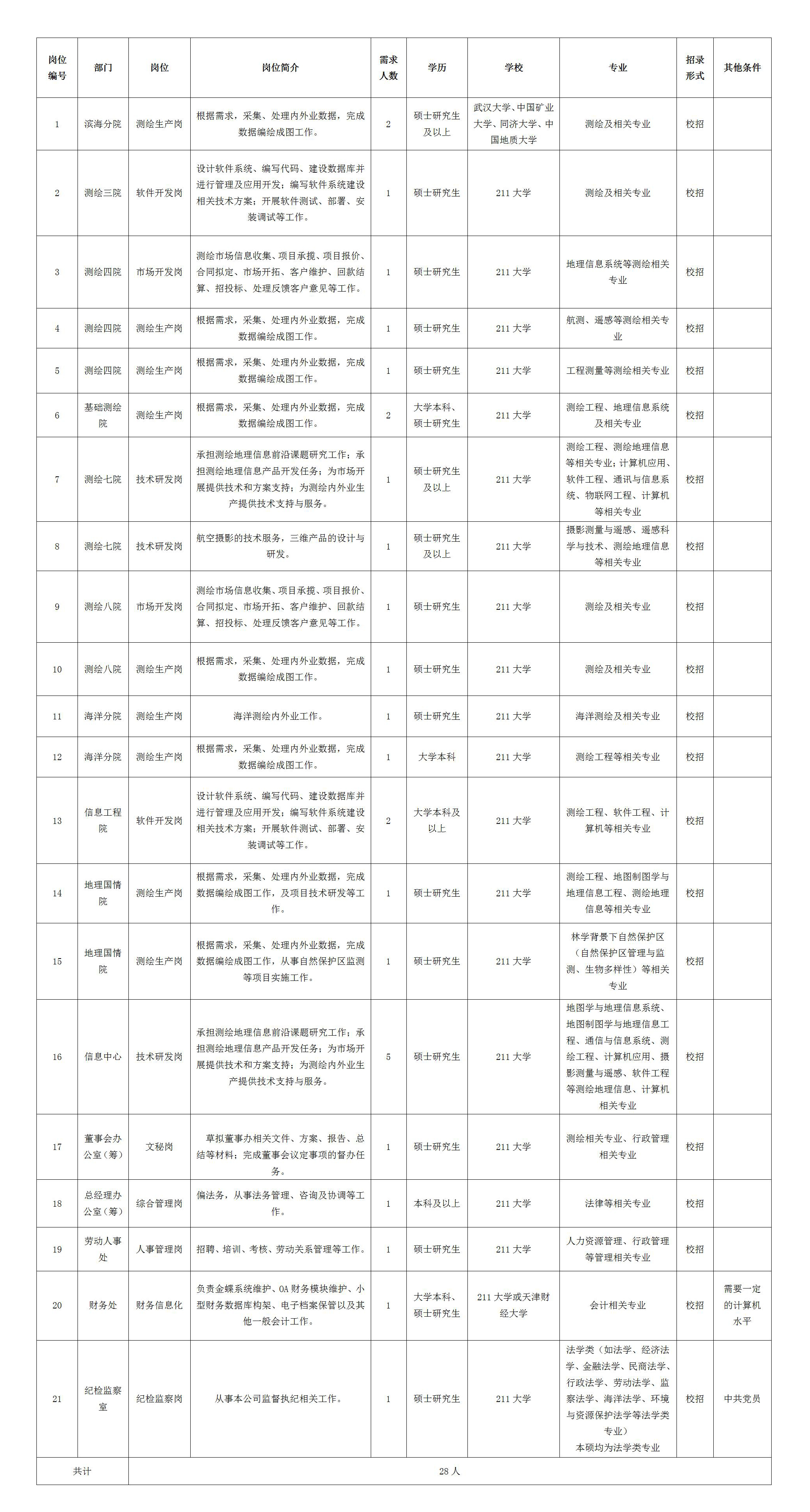 根據(jù)工作需要,天津市測繪院有限公司擬公開招聘應(yīng)屆高校畢業(yè)生28名,具體事項如下: