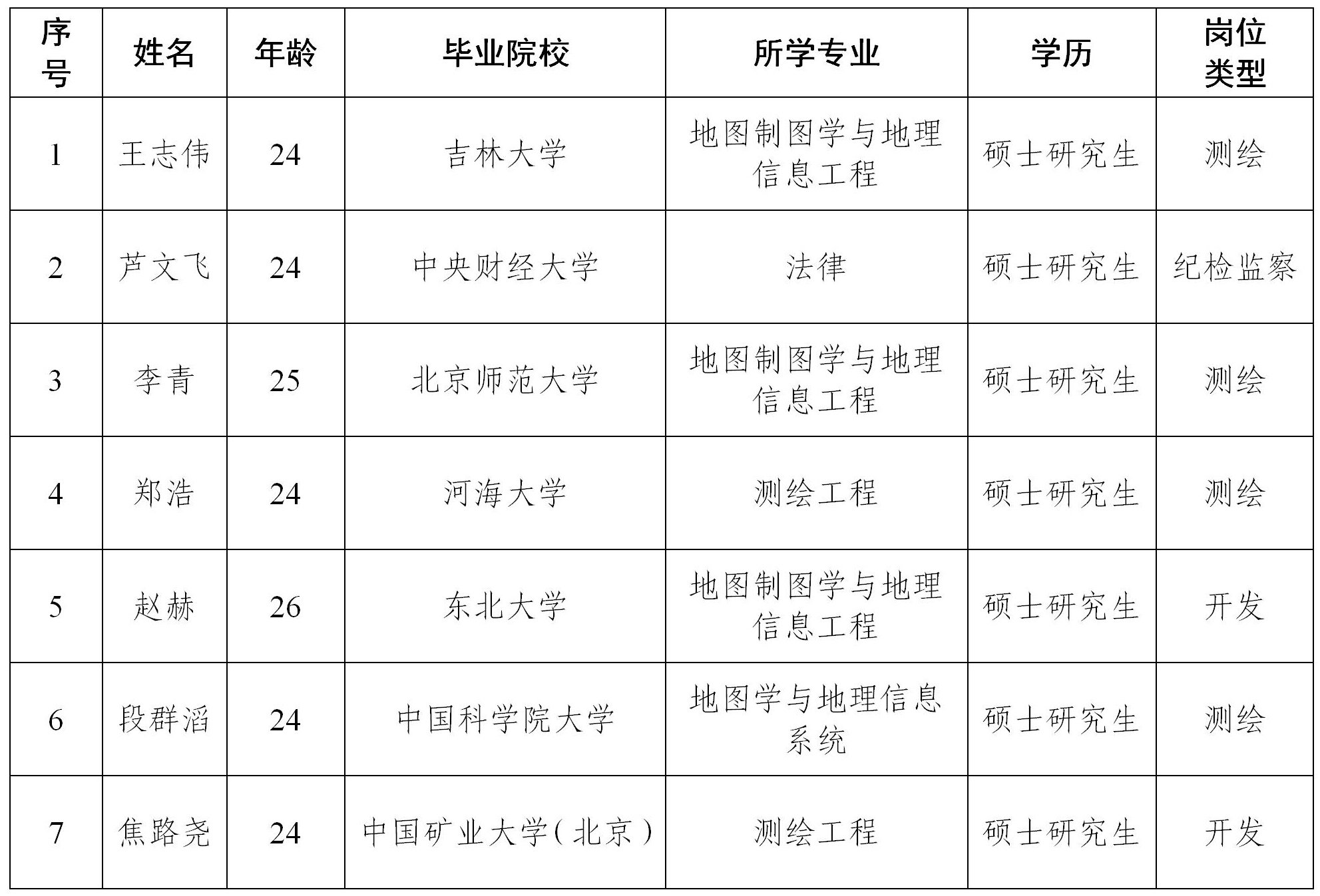 天津市測繪院有限公司2021年春季校園公開招聘工作已經(jīng)結(jié)束,經(jīng)面試、體檢等程序,擬錄用人員7名,現(xiàn)對擬錄用人員基本情況進行公示。(排名以姓氏筆畫為序。)