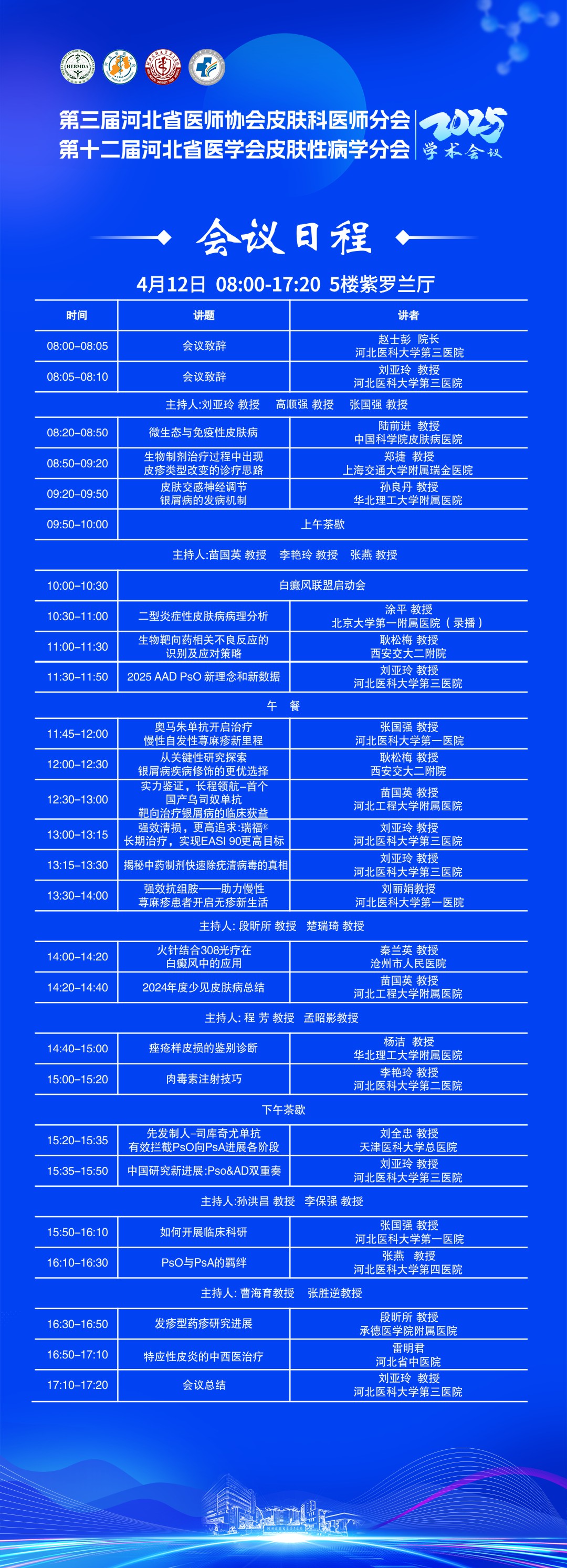 由河北省醫(yī)師協(xié)會(huì)皮膚科醫(yī)師分會(huì)、河北省醫(yī)學(xué)會(huì)皮膚性病學(xué)分會(huì)聯(lián)合主辦,河北醫(yī)科大學(xué)第三醫(yī)院、河北醫(yī)科大學(xué)第一醫(yī)院共同承辦的“第三屆河北省醫(yī)師協(xié)會(huì)皮膚科醫(yī)師分會(huì)暨第十二屆河北省醫(yī)學(xué)會(huì)皮膚性病學(xué)分會(huì)2025年學(xué)術(shù)會(huì)議”定于2025年4月11日-12日在河北石家莊市舉辦。