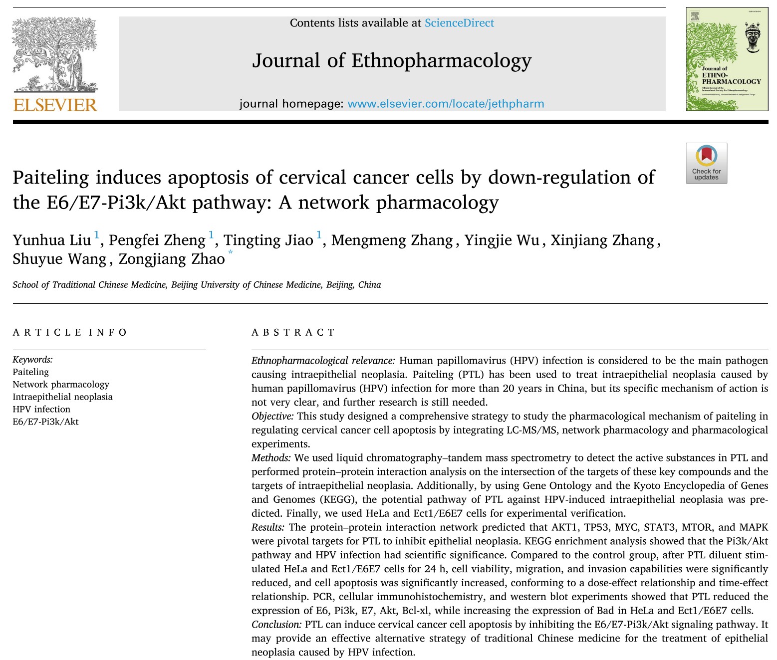 這項(xiàng)題為《結(jié)合網(wǎng)絡(luò)藥理學(xué)破譯派特靈通過(guò) e6/e7-pi3k/akt 信號(hào)通路誘導(dǎo)宮頸癌細(xì)胞凋亡》的研究,聚焦于中藥在 HPV 感染防治領(lǐng)域的科學(xué)價(jià)值。網(wǎng)絡(luò)藥理學(xué)是基于系統(tǒng)生物學(xué)的理論,對(duì)生物系統(tǒng)的網(wǎng)絡(luò)分析 ,選取特定信號(hào)節(jié)點(diǎn)進(jìn)行多靶點(diǎn)藥物分子設(shè)計(jì)的新學(xué)科。讓研究者們能夠基于系統(tǒng)醫(yī)學(xué)的角度闡明中醫(yī)藥的多靶點(diǎn)治療作用,將中醫(yī)藥化合物相關(guān)靶點(diǎn)和疾病網(wǎng)絡(luò)整合起來(lái),探索中醫(yī)藥背后的機(jī)制。