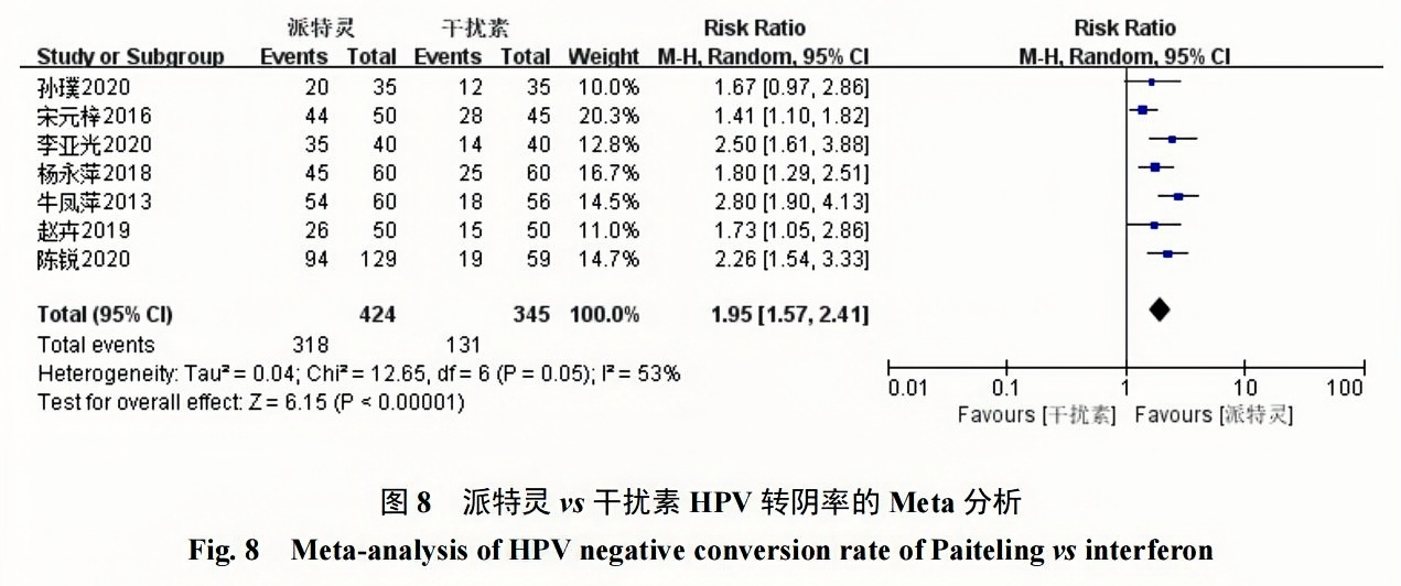 派特靈治療HR-HPV療效顯著,安全性較高值得臨床進一步推廣?相較于干擾素,派特靈療效更為顯著?但由于受納入研究樣本量所限,研究結(jié)果有可能存在偏倚,尚需更多高質(zhì)量大樣本的臨床研究予以驗證?