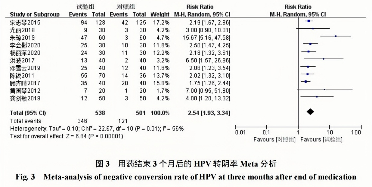 2組HPV轉(zhuǎn)陰率對比具有統(tǒng)計學意義[RR=2.54,95%CI(1.93,3.34),P<0.00001]。見圖3。