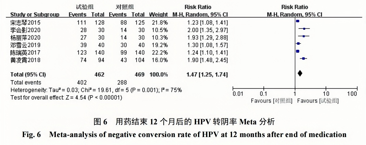 2組HPV轉(zhuǎn)陰率對比具有統(tǒng)計學意義[RR=1.47,95%CI(1.25,1.74),P<0.00001]?見圖6?