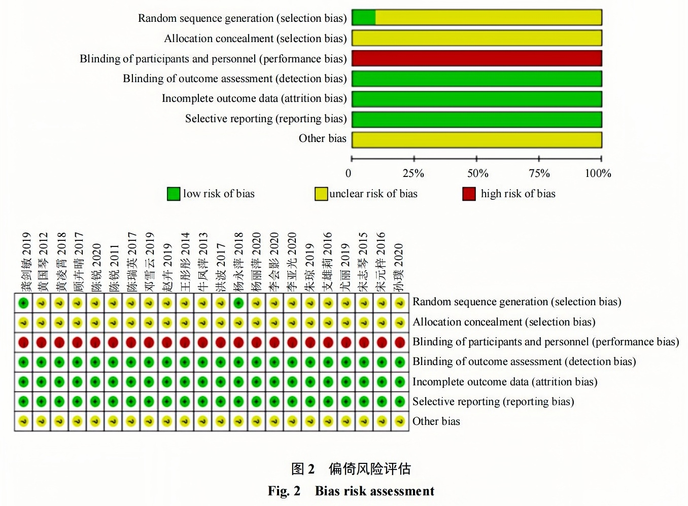 因納入的22項研究均無足夠信息明確是否存在高低偏倚,故均判定為未知風險。具體偏倚風險評估見圖2。