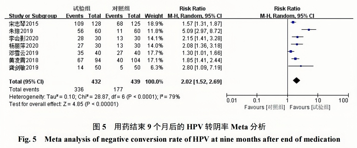 2組HPV轉(zhuǎn)陰率對比具有統(tǒng)計學意義[RR=2.02, 95%CI(1.52,2.69),P<0.00001]。見圖5。