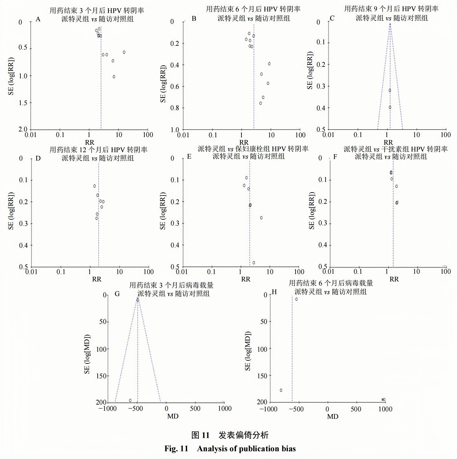 本研究的分組均分別進行了發(fā)表偏倚分析,漏斗圖顯示2側(cè)分布基本對稱,提示存在發(fā)表偏倚的可能性較小。見圖11。