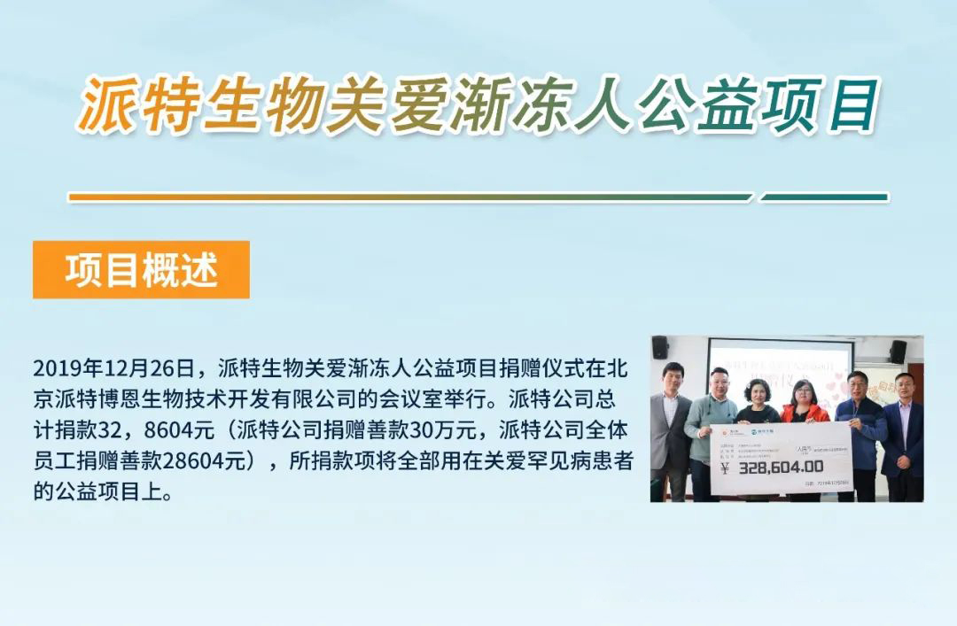 【派特生物關(guān)愛漸凍人公益項(xiàng)目一助力漸凍人舒暢呼吸】是由蒲公英漸凍人關(guān)愛中心攜手派特生物公司發(fā)起的公益項(xiàng)目,派特生物總資助金額149000元(拾肆萬九仟元整) 。