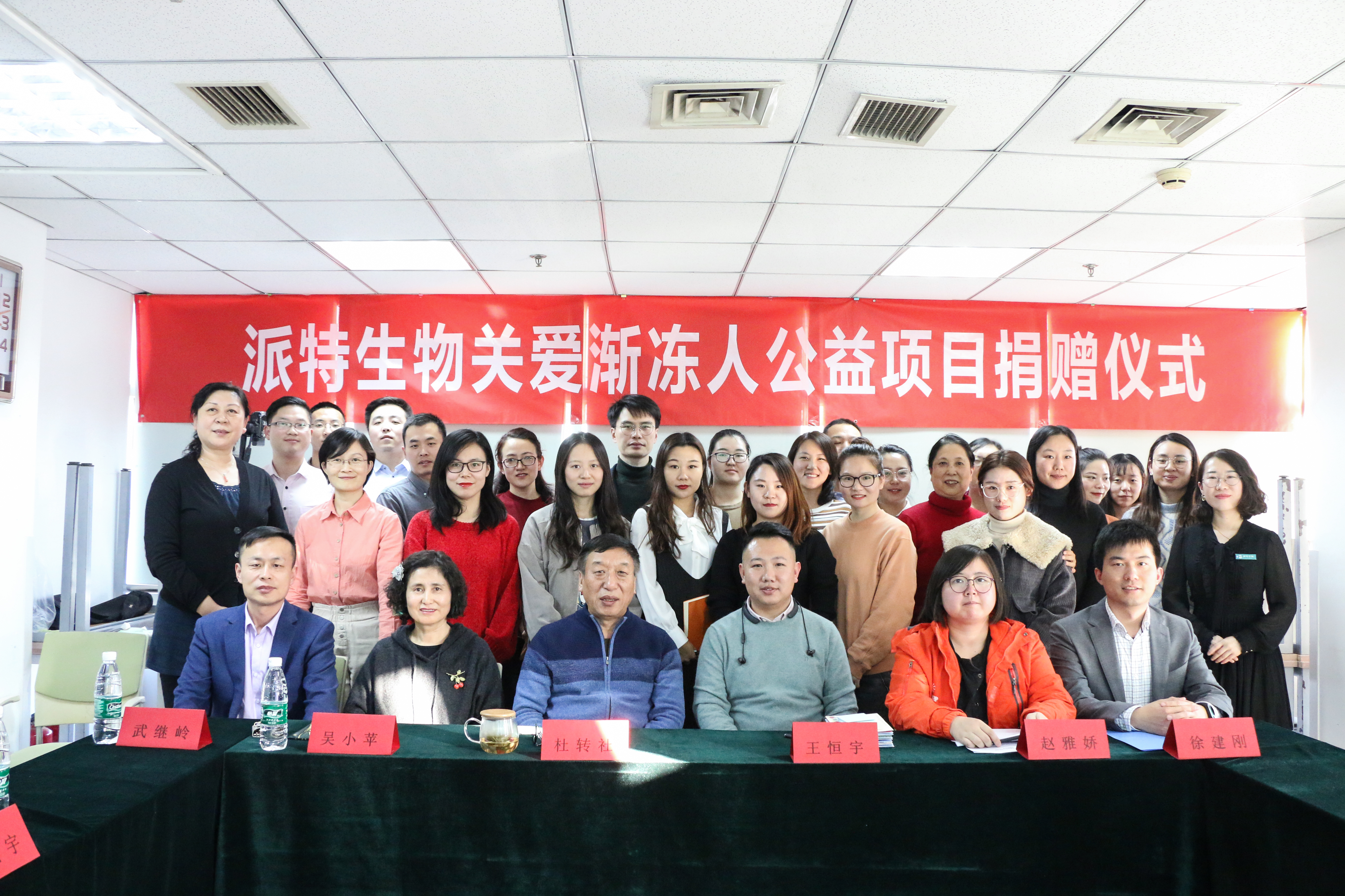 2019年12月26日,派特公司關(guān)愛漸凍人公益項(xiàng)目捐贈(zèng)儀式在派特公司總部順利舉行。 蒲公英漸凍人罕見病關(guān)愛中心副理事長王恒宇,關(guān)愛漸凍人公益項(xiàng)目項(xiàng)目主任趙雅嬌,法務(wù)理事徐建剛等作為受捐方代表出席捐贈(zèng)儀式。派特公司總經(jīng)理杜轉(zhuǎn)社,副總經(jīng)理吳小蘋,副總經(jīng)理武繼嶺,品牌管理總監(jiān)陳飛宇,辦公室主任、人力資源部經(jīng)理姚軍,及二十余位派特員工代表出席捐贈(zèng)儀式。