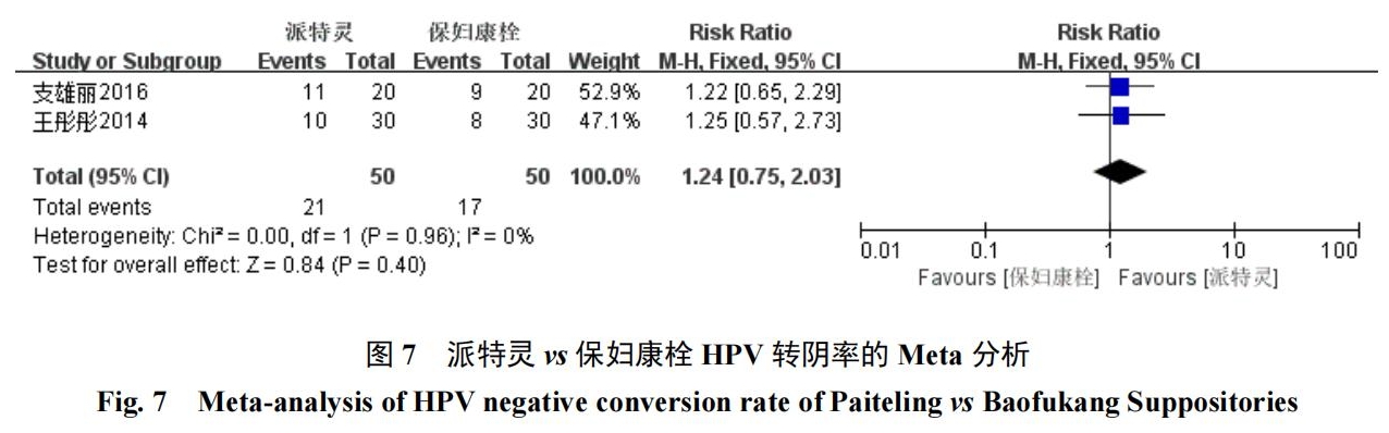 2項研究[19-20]報道了派特靈與保婦康栓的療效對比,采用固定效應(yīng)模型(I2=0,P=0.96),結(jié)果顯示派特靈組HPV轉(zhuǎn)陰率為42%(21/50),保婦康栓組HPV轉(zhuǎn)陰率為34%(17/50);