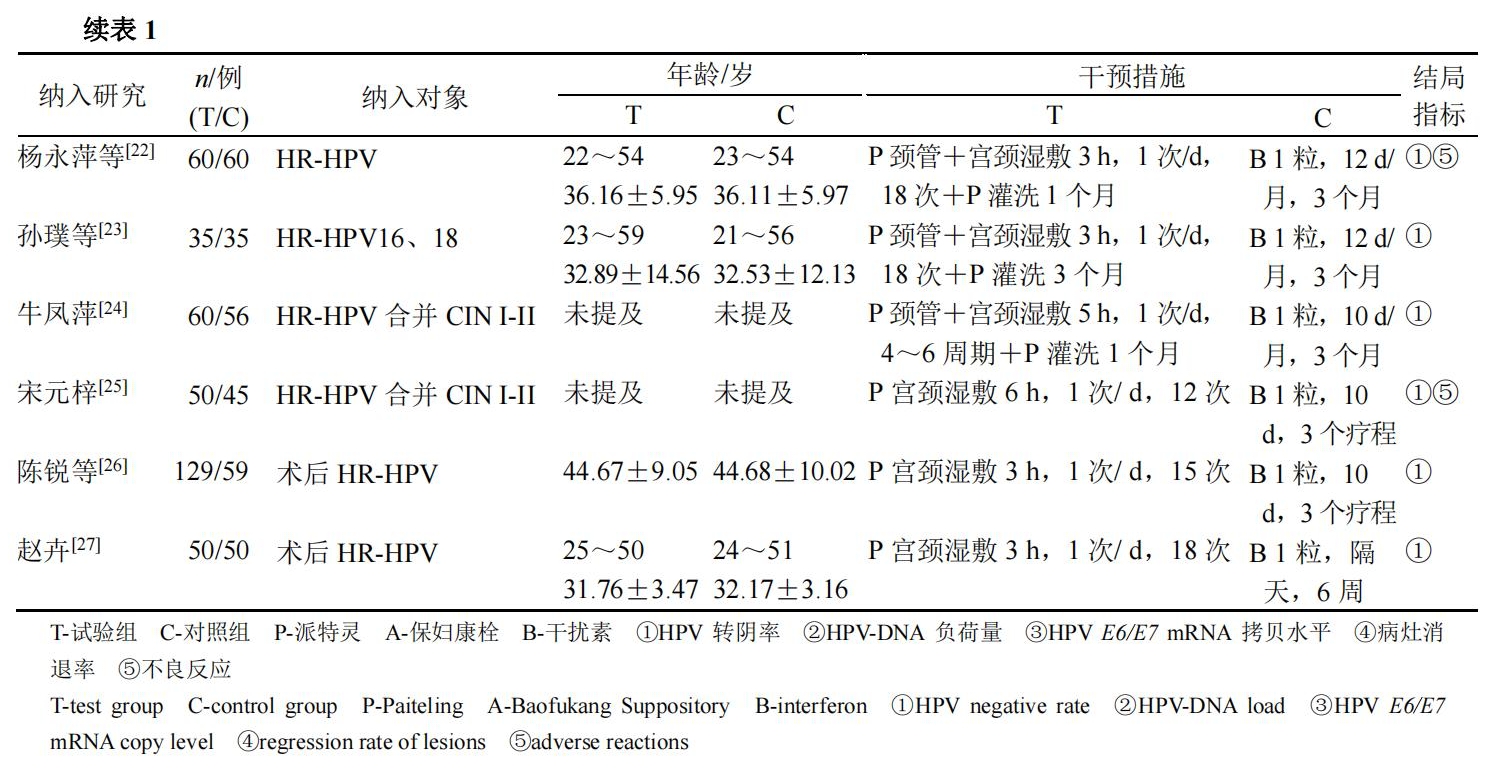 其中7項RCT[9-11,16,22-24]外加陰道涂擦或灌洗1~3個月?保婦康栓及干擾素組均為每晚睡前1粒塞陰,保婦康栓總用量為14?24粒,干擾素總用量為14?30粒?具體基本特征見表1?
