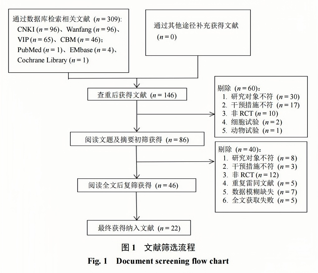 初檢共獲得309篇文獻,其中中文文獻303篇,英文文獻6篇;刪除重復文獻163篇,其中中文文獻162篇,英文文獻1篇;閱讀標題及摘要獲得86篇,進一步閱讀全文復篩,最終納入22項RCT[6-27]?文獻篩選流程見圖1?