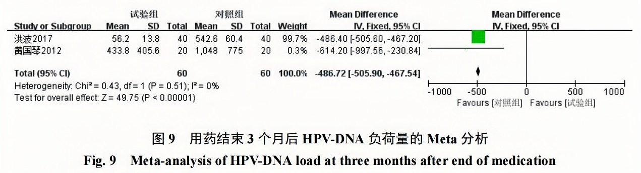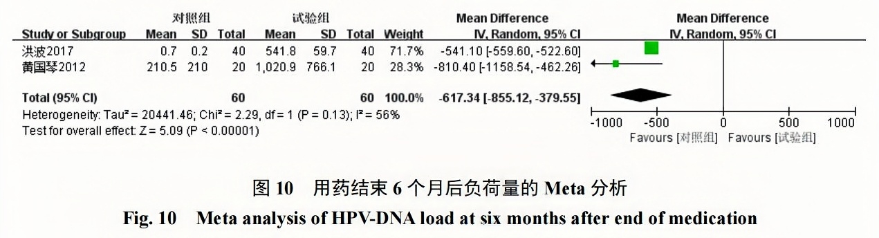 Meta結(jié)果顯示,派特靈組用藥結(jié)束后3個月及6個月HPV-DNA負荷量明顯低于隨訪對照組,2組在2個時間段HPV-DNA負荷量對比均具有統(tǒng)計學意義[用藥結(jié)束后3個月:MD=?486.72,95%CI(?505.90,?467.54),P<0.00001;